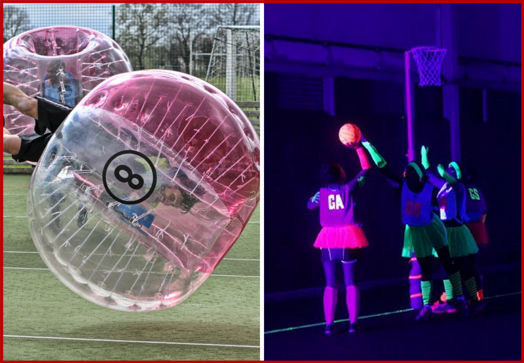 UV lights and fluorescent bibs allow you to dance, dodge and play sport whilst lighting up the room. The Sports played include Dodgeball, Netball, Volleyball.